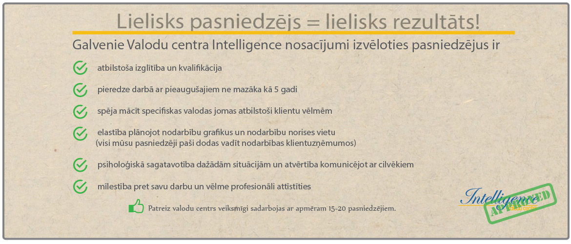 SIA "Valodu centrs Intelligence" tika dibināts 2010.gadā, sapulcinot kopā lieliskus dažādu svešvalodu pasniedzējus.